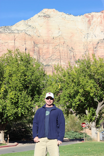 So again, it was around 80 degrees in the daytime while we were there, so Kevin wore shorts and a t-shirt most of the time. We got out to start on my hike and it was a little cooler than he anticipated, because we were at the very top of the mountainy area. He reconsidered and put on a really thin long-sleeved shirt, but when we actually started walking, it was COLD. And I mean, I was even a little chilly and I had on a long sleeved shirt, boots, and a vest. Kevin had to do a little bit of running to warm up. I mean who goes to Utah in November and wears shorts and a t-shirt!?!